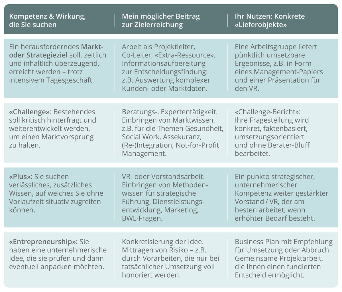 Einbezug der Entwicklungs- und Ertragsseite / „Chancen-Fokus“: Marktstrategien, Mehrwerte für Kunden, komplexe Entwicklungsprozesse – dies sind Themen, in denen ich mich auskenne. Geht es ausschliesslich um Prozess- und Kostenoptimierung, bin ich kein geeigneter Partner.