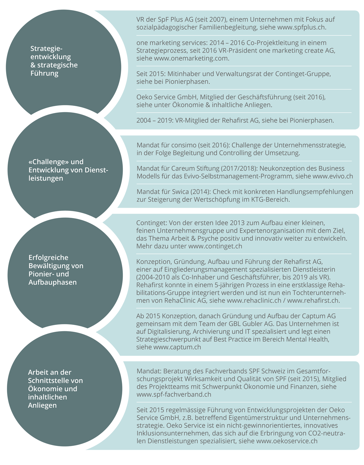Erfolgreiches Unternehmertum erfordert Teamwork und einen langen Atem: Ergebnisse und Wirkungen von strategischer oder pionierhafter Arbeit sind erst nach Jahren wirklich verankert. Ich bin stolz darauf, einige innovative Unternehmen seit langer Zeit begleiten zu können, und dies in unterschiedlichen, dem Bedarf entsprechenden Funktionen und Rollen.